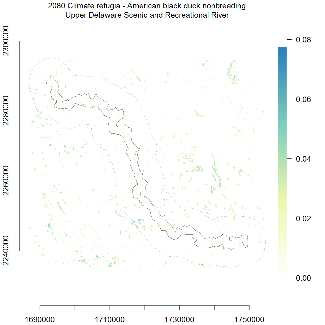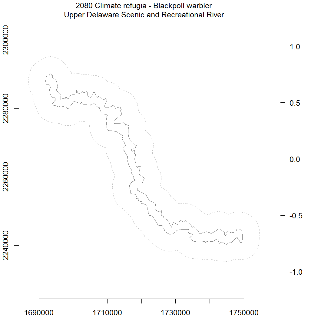 Refugia score, This score that reflects the density of refugia for a species in a given park. In particular it is how well the climate refugia for the species is represented in the park relative to the average climate refugia value for that species in the region as a whole. A value of 1 indicates that the park has (on average) the average value for the region. Higher values indicate greater concentration of climate refugia for the species within the park; a five for instance would mean that the park has 5 times the region average refugia capability for the species. Since it’s a relative density this static really reflects the quality of the park independent of it’s size. The number is a link to a map of the 2080 Climate Refugia for the species in the park and buffer.