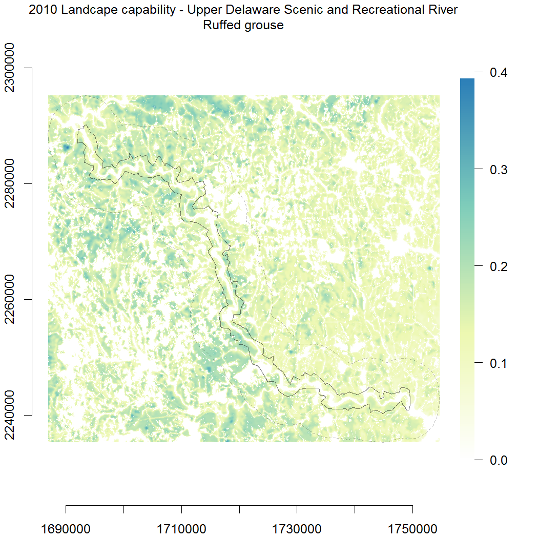 These statistics are based on Designing Sustainable Landscapes (DSL) models of 2010 Landscape Capability (LC) and 2080 Climate Refugia. Both of these datasets are indices of the ability of the landscape and climate to support populations of the species. They have a theoretical range from 0 to 1 but in practice the maximum values are usually below 1. Both LC and Climate Refugia are based on 2010 landcover but differ in the climate suitability; in LC the climate suitability is derived from 2010 climate variables while climate refugia is based on 2080 climate, while limiting the extent of the species to areas where the climate was suitable in 2010. For a full description of the species modeling process see the documentation. The underlying GIS data is available at http://umassdsl.org - use the version 3 species data links.